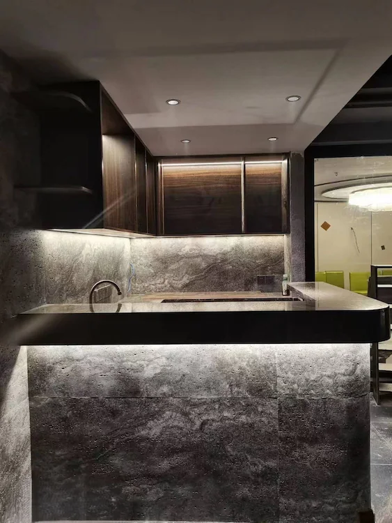 revestimento mineral dolomitic travertine dark grey aplicado em escritorio particular